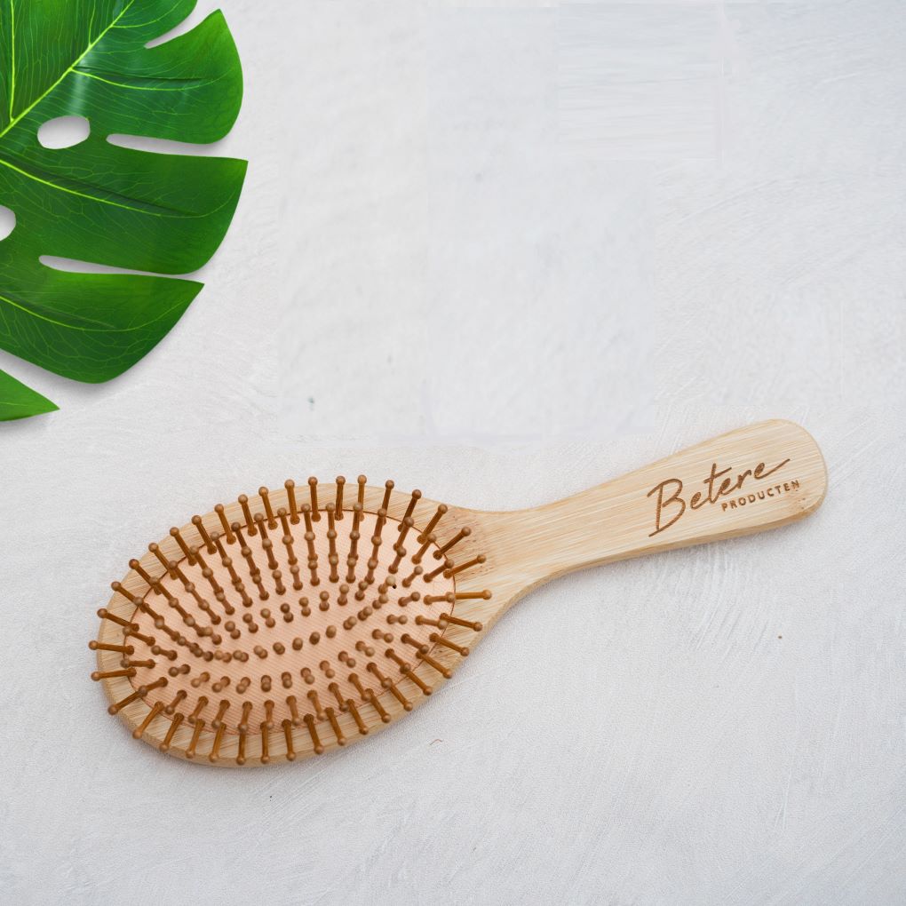 De bamboe haarborstel van Betere Producten biedt een duurzame en stijlvolle manier om je haar te verzorgen. Gemaakt van 100% bamboe met een natuurlijk rubberen kussen, is deze borstel geschikt voor alle haartypes, van lang en sterk tot krullend. De borstel ontwart het haar moeiteloos en is antistatisch, waardoor je haar er altijd prachtig uitziet. Voor extra hygiëne kun je de borstel na gebruik in het bijgeleverde opbergzakje doen. Een slimme keuze voor een verantwoorde haarverzorging—goed voor jou en de aarde!