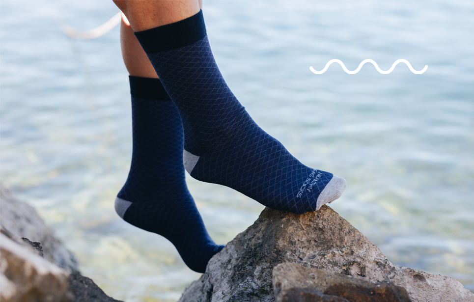 De sokken zijn gemaakt van biologisch katoen en geregenereerd ECONYL nylon. Dit nylon wordt gewonnen uit oude visnetten en ander oceaanafval. Door deze materialen te hergebruiken draag je direct bij aan het verminderen van plastic in zee en het beschermen van zeeleven. Tegelijk kies je voor sokken die zacht aanvoelen, goed ventileren en geschikt zijn voor intensief dagelijks gebruik.