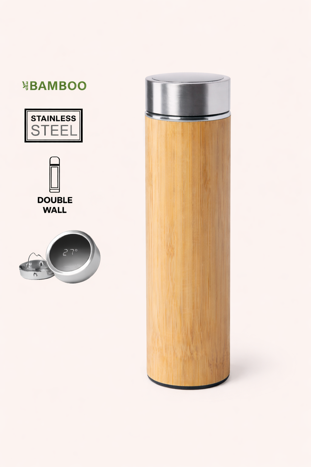 De bamboe buitenkant geeft de fles een rustige, natuurlijke uitstraling. Met de geïntegreerde filter voeg je eenvoudig thee, kruiden of fruit toe aan je water. De fles is BPA-vrij en veilig in gebruik. De temperatuurindicator werkt op een knoopcelbatterij die is inbegrepen, zodat de fles direct klaar is voor gebruik.